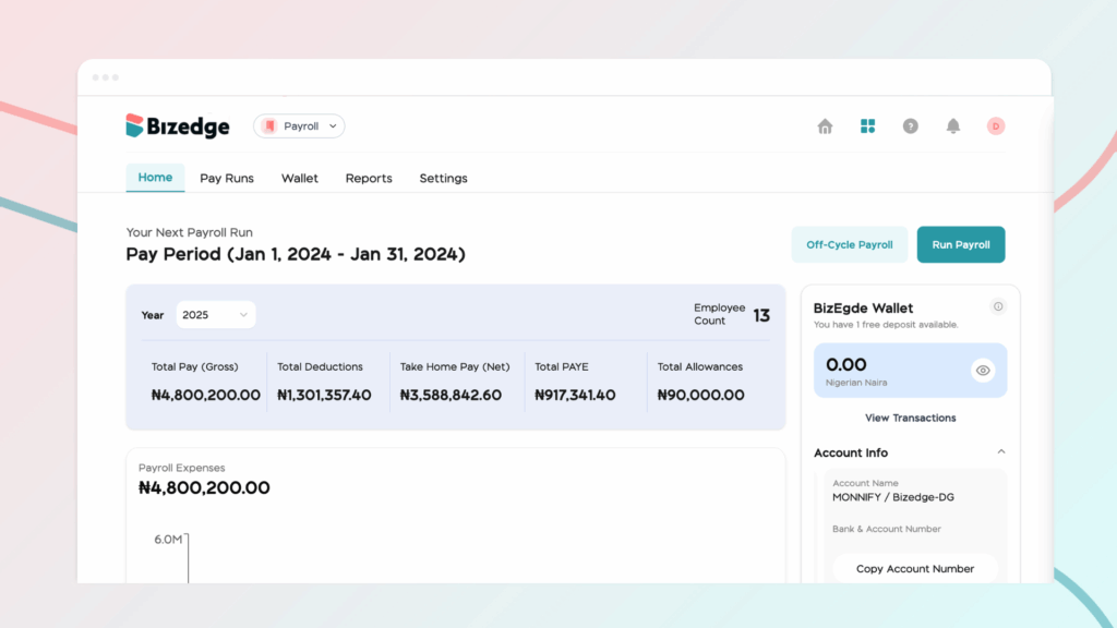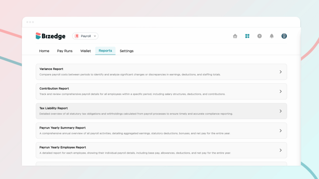 The BizEdge Payroll app provides everything you need to manage your payroll efficiently, from an overview of employee earnings and deductions to detailed reports, wallet management, and payroll settings.