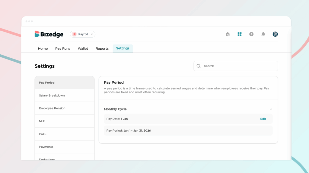 - Pay Period Setup – Define the frequency and schedule of payroll runs (monthly, bi-weekly, weekly, etc.)